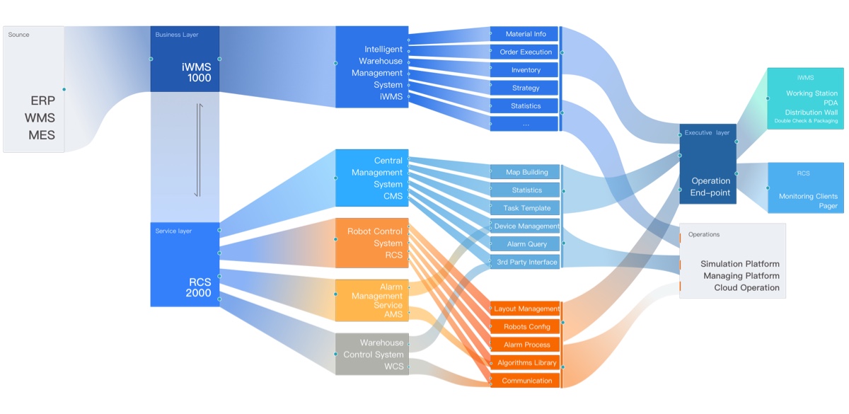 يدعم RCS التحكم في أنواعٍ متعددة من الروبوتات بل ومشاركة المسار نفسه، موفّرًا انتقالًا سلسًا من المستودع إلى خطّ الإنتاج وداخل المستودع وما إلى ذلك. ويتكامل iWMS-1000 مع RCS-2000 لتنفيذ التخطيط العنقودي لمئات الروبوتات المتنقّلة وإنجاز جميع مهام «البضائع إلى الشخص» (G2P) بمختلف أشكالها.
